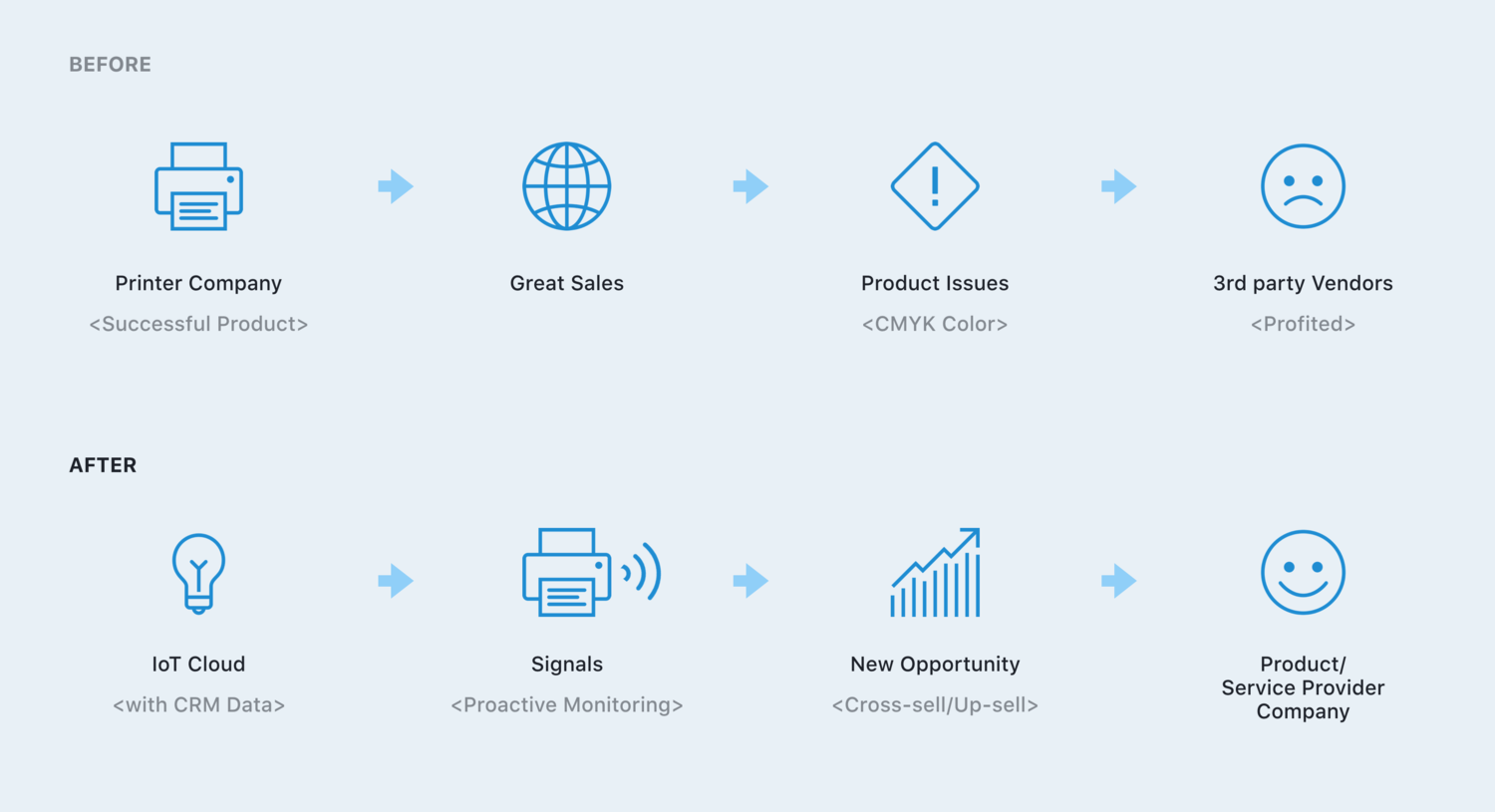 Since every printer emits signals error codes (such as ‘Low on ink’), an IoT event cloud could be set up to monitor those signals proactively and trigger an action based on a predefined workflow. For the above example, the moment the printer emits an ‘Low on ink’ signal, IoT Cloud could trigger a marketing email to the customer to choose the best deal for the cartridge.